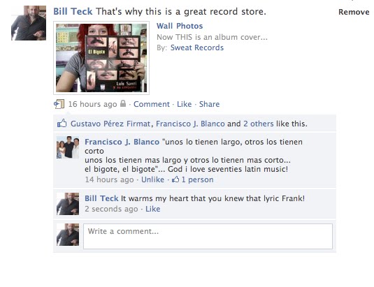 34 Comments and 71 “Likes” later – there were riches in like-minded local vibe-ness. Rich Ulloa – the legend of Yesterday & Today liked it – and Steve Saiz wrote “this album is the shit! miami latin funk descarga” while Andrew Yeomanson AKA DJ Le Spam chimed in “another masterpiece of album cover art by drago fernandez. the jam on this lp is called los filigreses.. funky electric piano getdown..”